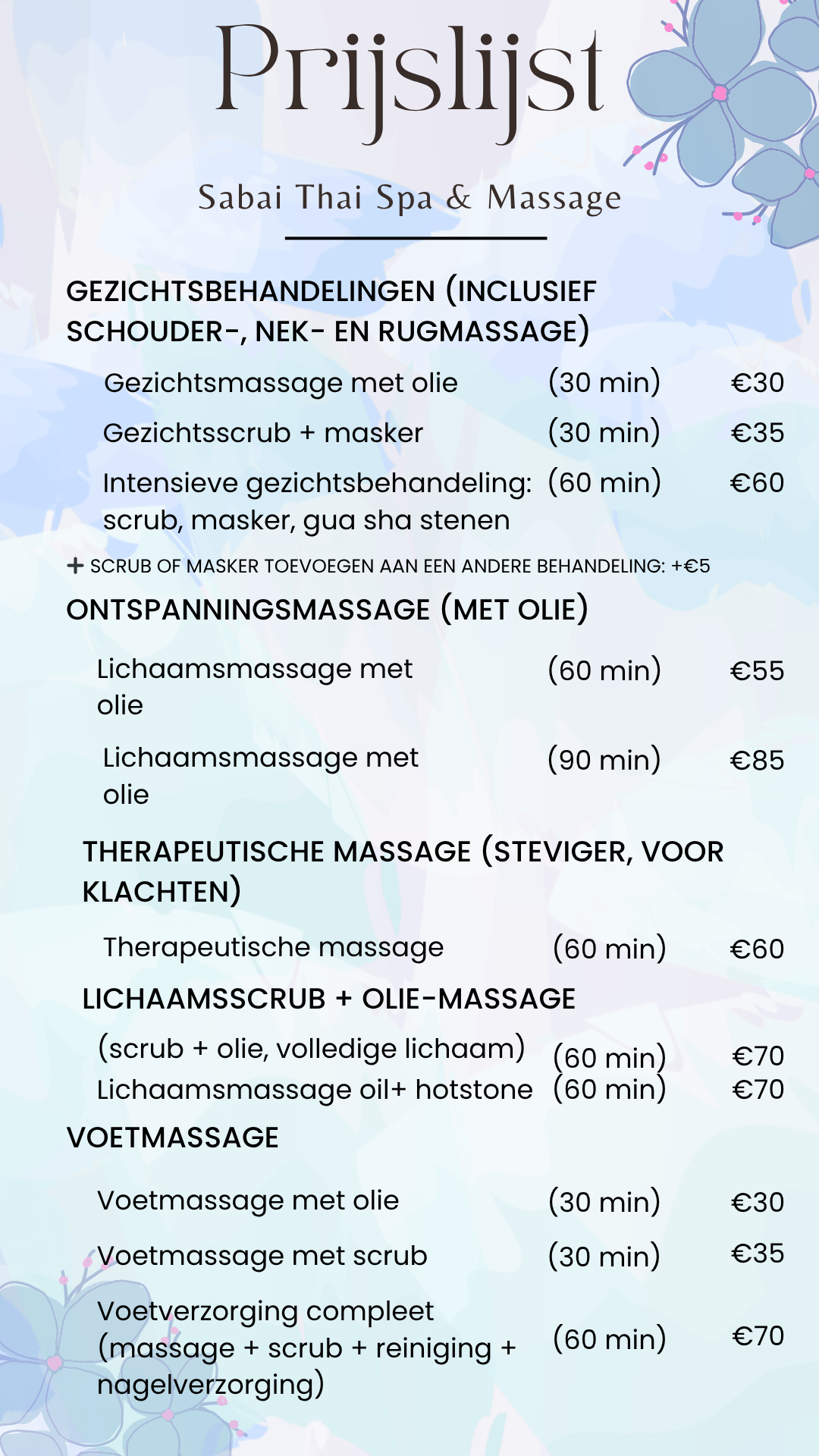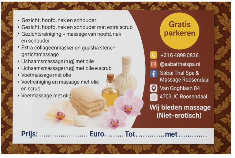 Bij Sabai Thai Spa & Massage in Roosendaal bieden wij een breed scala aan massages en behandelingen. Massages zijn alleen mét afspraak. Graag van te voren bellen of WhatsAppen.